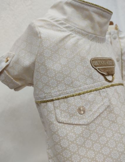 DETALHES: LAPELA COM FECHAMENTO EM BOTÕES DE PRESSÃO E VIVO DOURADO.